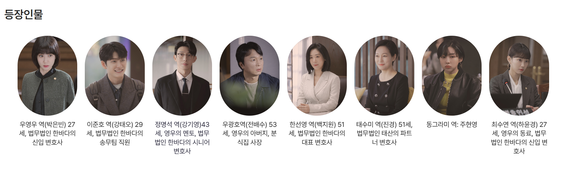 주요 등장인물로는 그녀의 상사이자 멘토 역할을 하는 ‘정명석 변호사’, 로펌 동료이자 로맨스의 상대가 되는 ‘이준호’, 우영우의 절친한 친구 ‘동그라미’ 등이 있습니다. 이들은 각각 우영우에게 영향을 주고 받으며, 그녀의 성장에 중요한 역할을 하게 됩니다. 특히 이준호와의 관계는 자폐인을 바라보는 일반인의 시선과 사랑의 가능성에 대해 고민하게 하는 계기를 마련합니다.